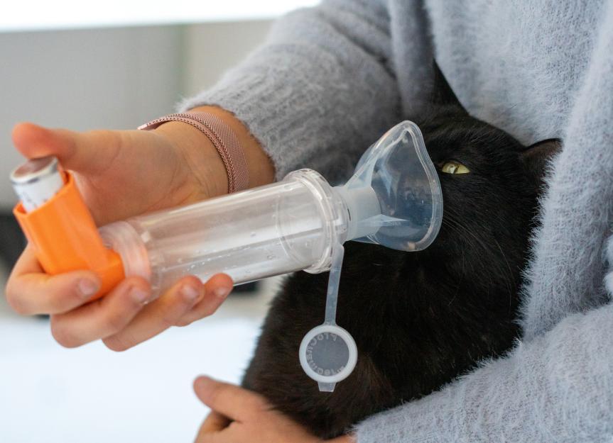 After diagnosis, asthma is usually treated at home using inhaled anti-inflammatory medications daily, with a rescue inhaler to use if there’s a significant flare-up. Some cats will be treated (at least short-term) with oral medications in addition to, or instead of, inhalers.