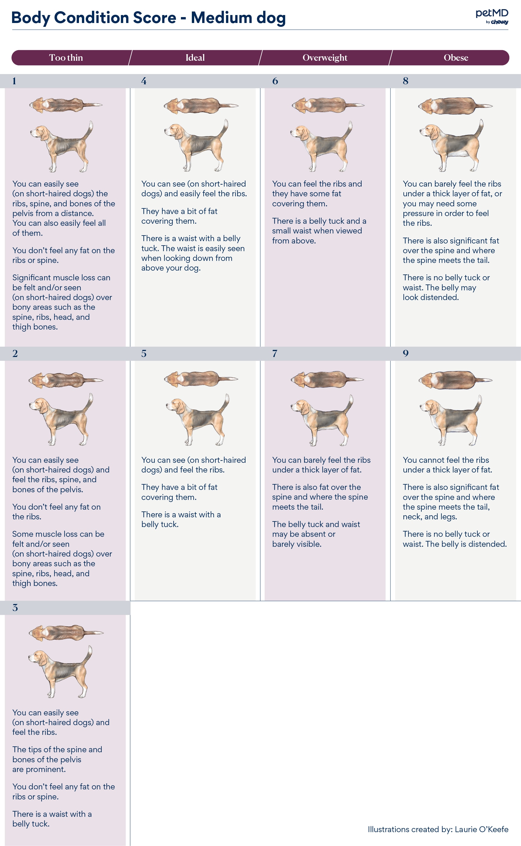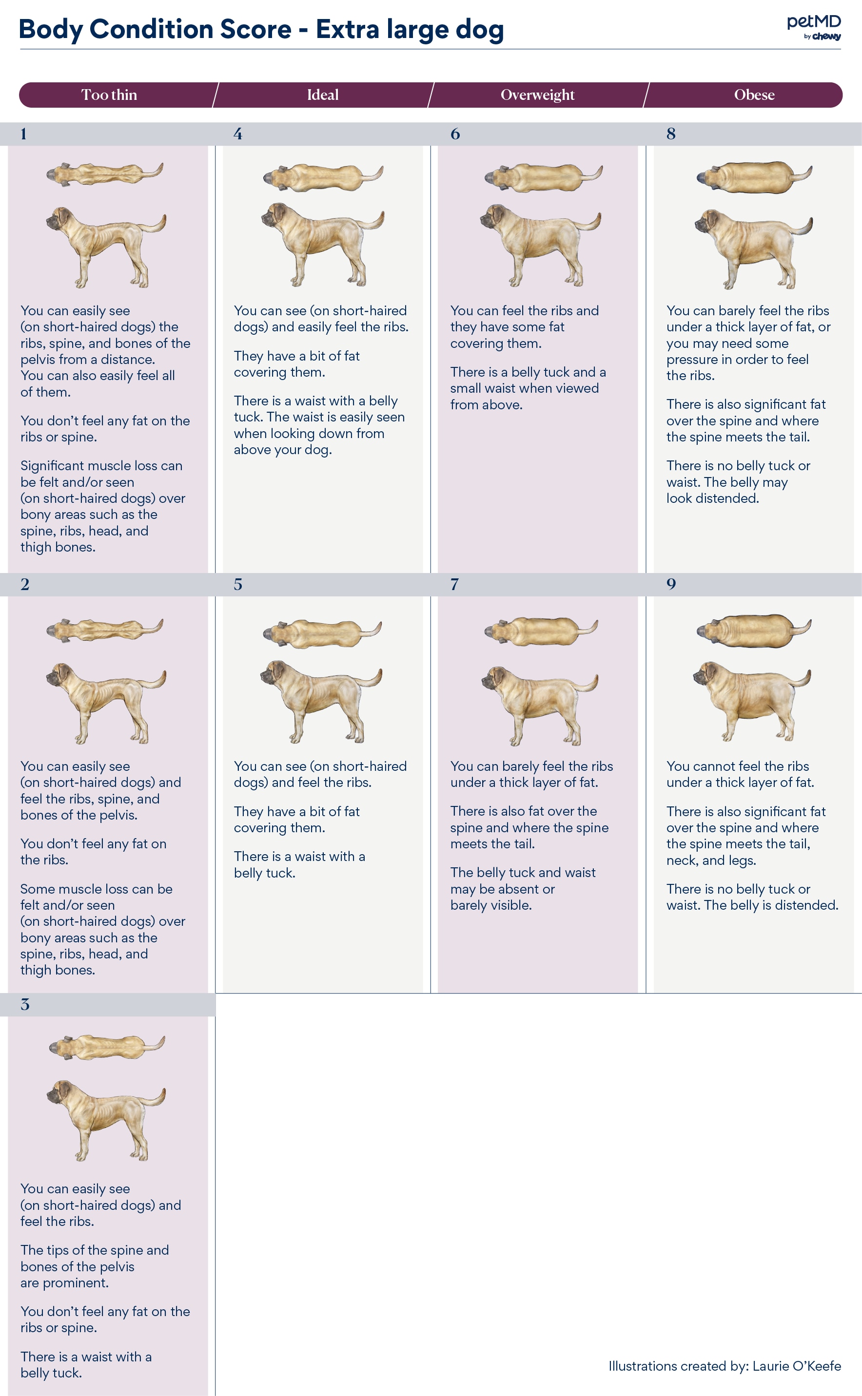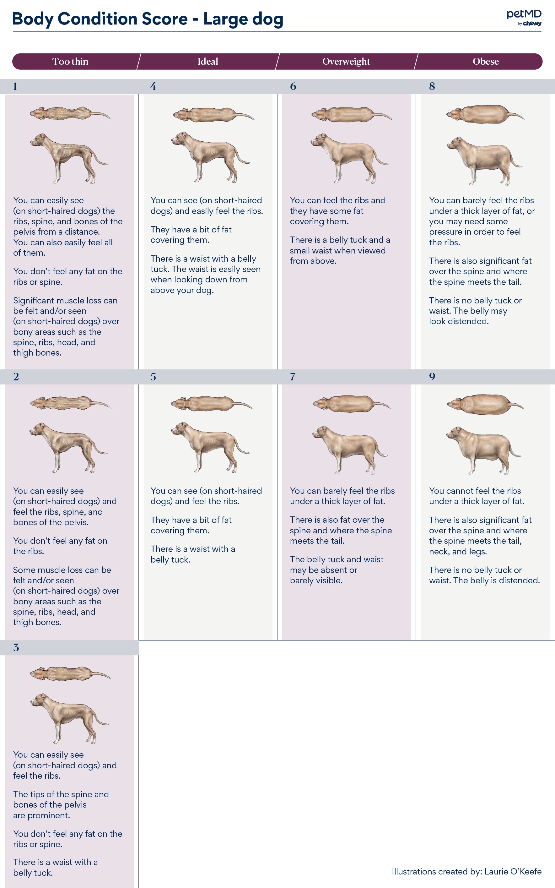The two most commonly used body condition scores are a five-point scale (where three is considered ideal) and a nine-point scale (where four to five is considered ideal). Your dog should have an hourglass shape when viewed from above if they are at their ideal body weight, which can be determined through their body condition score.
